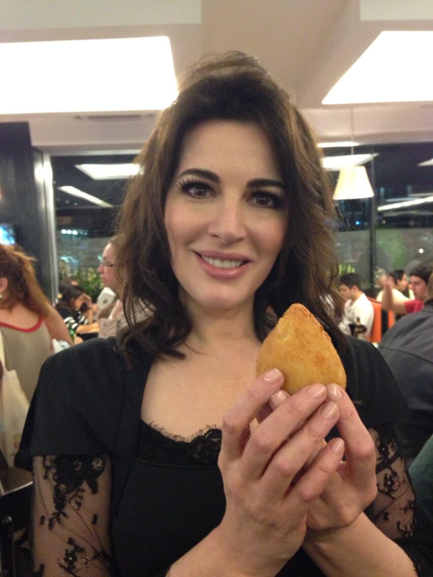 Um dos pontos em que Nigella passou foi a padaria Bella Paulista. Apesar de não ser exatamente "de pobre", como nosso blog prefere, foi por lá que Nigella conheceu um dos pilares da fast food de pobre de raiz: a coxinha. E publicou uma foto em seu Twitter a tratando como merece: uma iguaria.